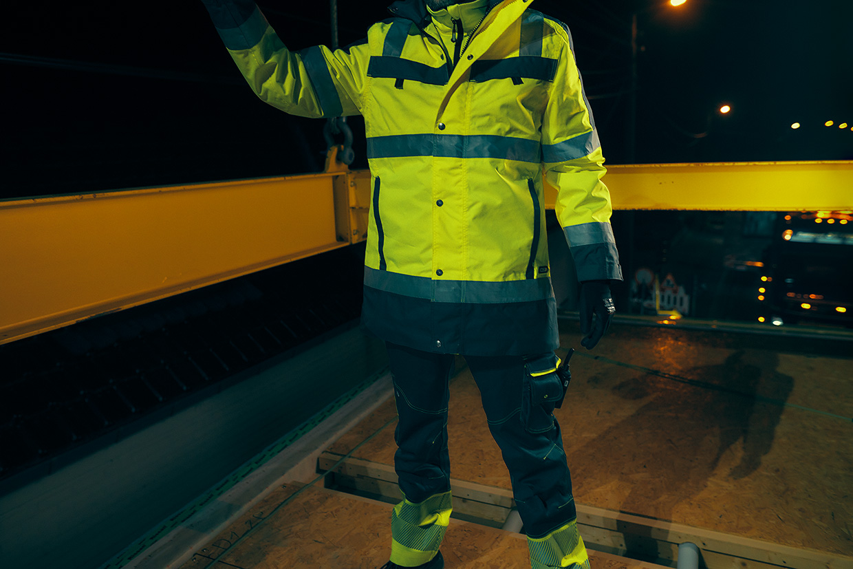 DASSY Logix ist eine Kollektion vor allem für die Logistikbranche, die Lagerhaltung und das Transportwesen. Der fluoreszierende Stoff und die reflektierenden Akzente runden das Design ab.